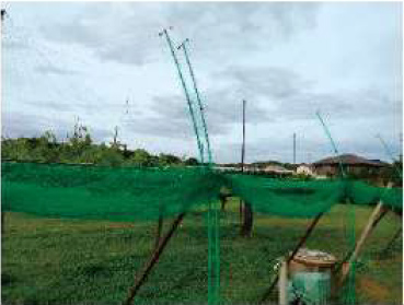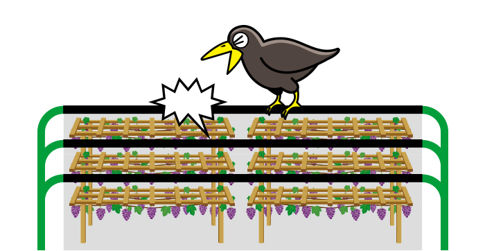 艶消し黒色の軽量繊維線でカラスの視界から消える防護線を弾性ポールを用いて、圃場の天井部に張ることによりカラスの侵入を防ぎます。「クロウシラズ」は東レの開発した高強力スーパー繊維「シベラス®」を芯糸に使用し、 周囲をナイロンでコーティングした高耐候性強力線です。