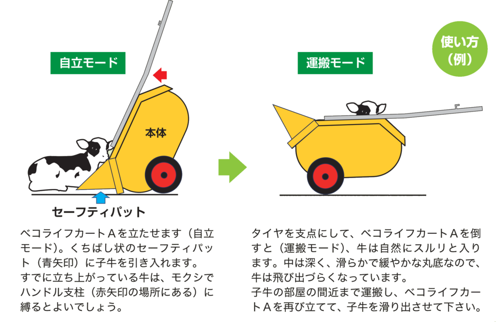 タイヤを支点に倒す「運搬モード」では、子牛が自然にスルリと入り、再び立てれば滑らせて降ろせます。現場の作業負担を大きく軽減します。。