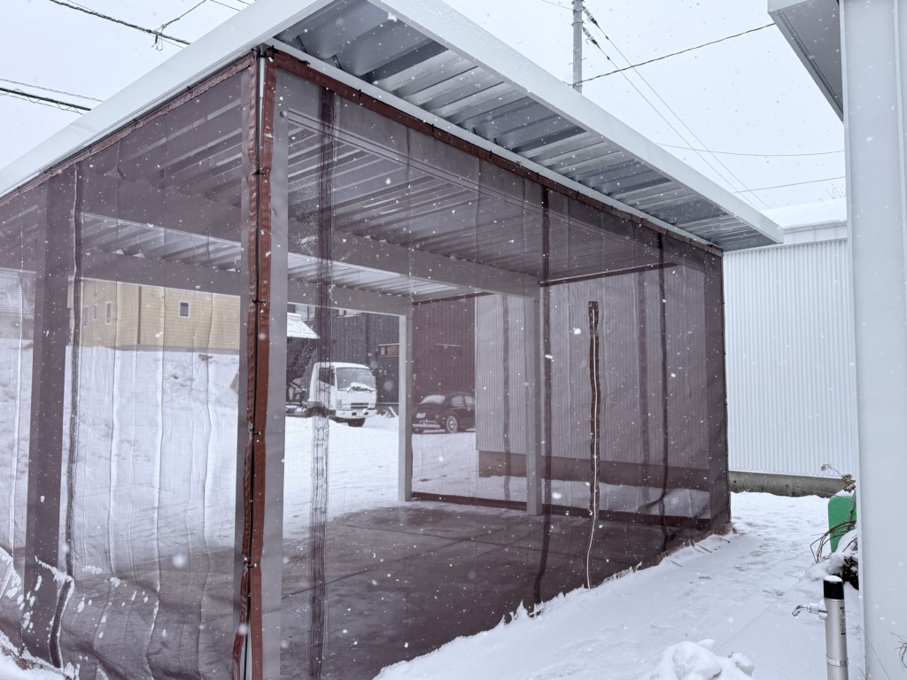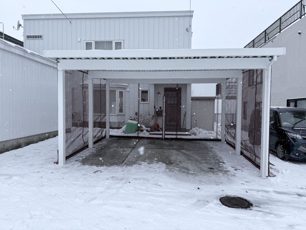 カーポートにブラウン(茶色)の防雪・防風ネットを設置し、雪や風の吹き込みを軽減します。 写真の事例は2台用カーポートへの設置事例です。 ネット素材を使用することで、完全に塞がず、圧迫感を抑えながら 実用的な防雪・防風対策を実現しています。